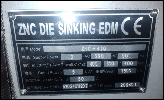 Electroerosionadora por penetración, Marca ZNC DIE SINKING EDM, fabricación Taiwán, NUEVA, Mod. ZNC 430, Control Check, recorrido en X 400mm , Y 300 mm , Z 200 mm,, completa de , mesa magnética, lampara de iluminación, extintor,  tanque de lubricación con recogedor de descartes Manual, Niveladores, llaves de servicio.  Ref.- UM/O 428