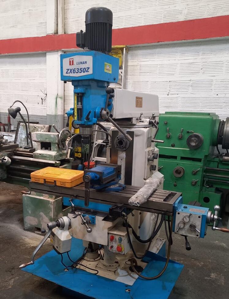 Fresadora a Torreta, fabricación China, N.2, Mod ZX6350Z, área de mesa 1300x270mm.,  tipo Mixta, Embrague para velocidades en Piñones, movimiento automático original, completa de juego de boquillas, dos arboles portafresas, prensa, bomba de refrigeración Ref.;  UM/O 406