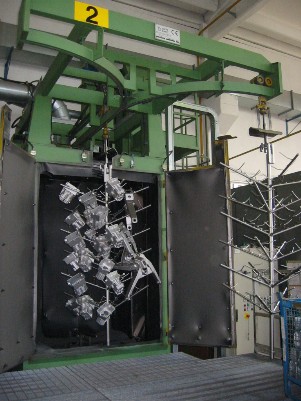 Granalladora a doble gancho, Marca GM, carga 500 Kg., por cada gancho, dimension máxima de pieza en diametro, 1200mm, en altura 1800mm, completo con filtro, año 2000, revisada, entrega inmediata a confirmar enn el momento del pedido. Año 2000, horas de trabajo 5000. Máquina para importación directa. Ref.- UM/ I 001